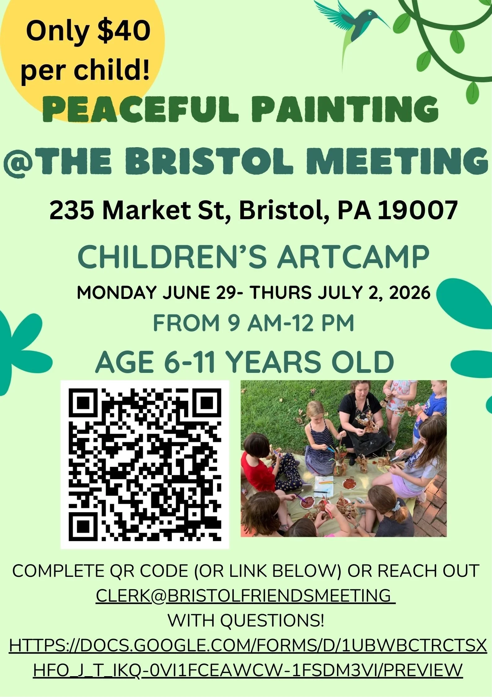 Peaceful Painting Children's Art Camp Monday, June 29, 2026 9:00 AM Thursday, July 2, 2026 12:00 PM Bristol Friends Meeting 235 Market Street Bristol, PA 19007 (map) Google Calendar ICS View fullsize