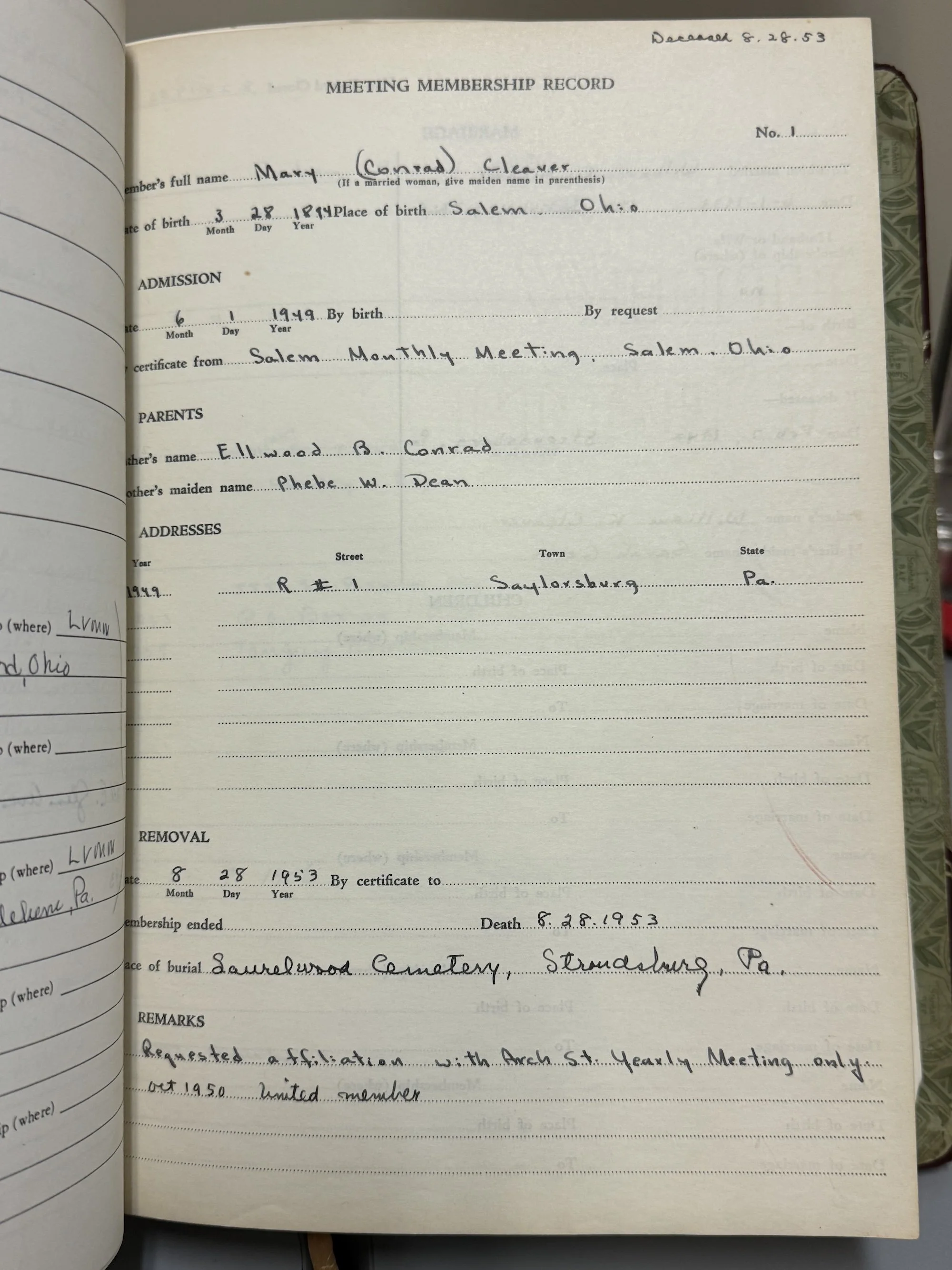 At the end of this heartfelt process of deliberation and subsequent construction is a party! A celebration is being planned (tentatively for June 1st) for Lehigh Valley Meeting’s 75th anniversary of its recognition as a monthly meeting within Philadelphia Yearly Meeting. Contributing to the celebration is the discovery of the original membership book, which was found in a locked cabinet. Special thanks to Lehigh Valley recorder of membership Lois Sunflower for locating it.